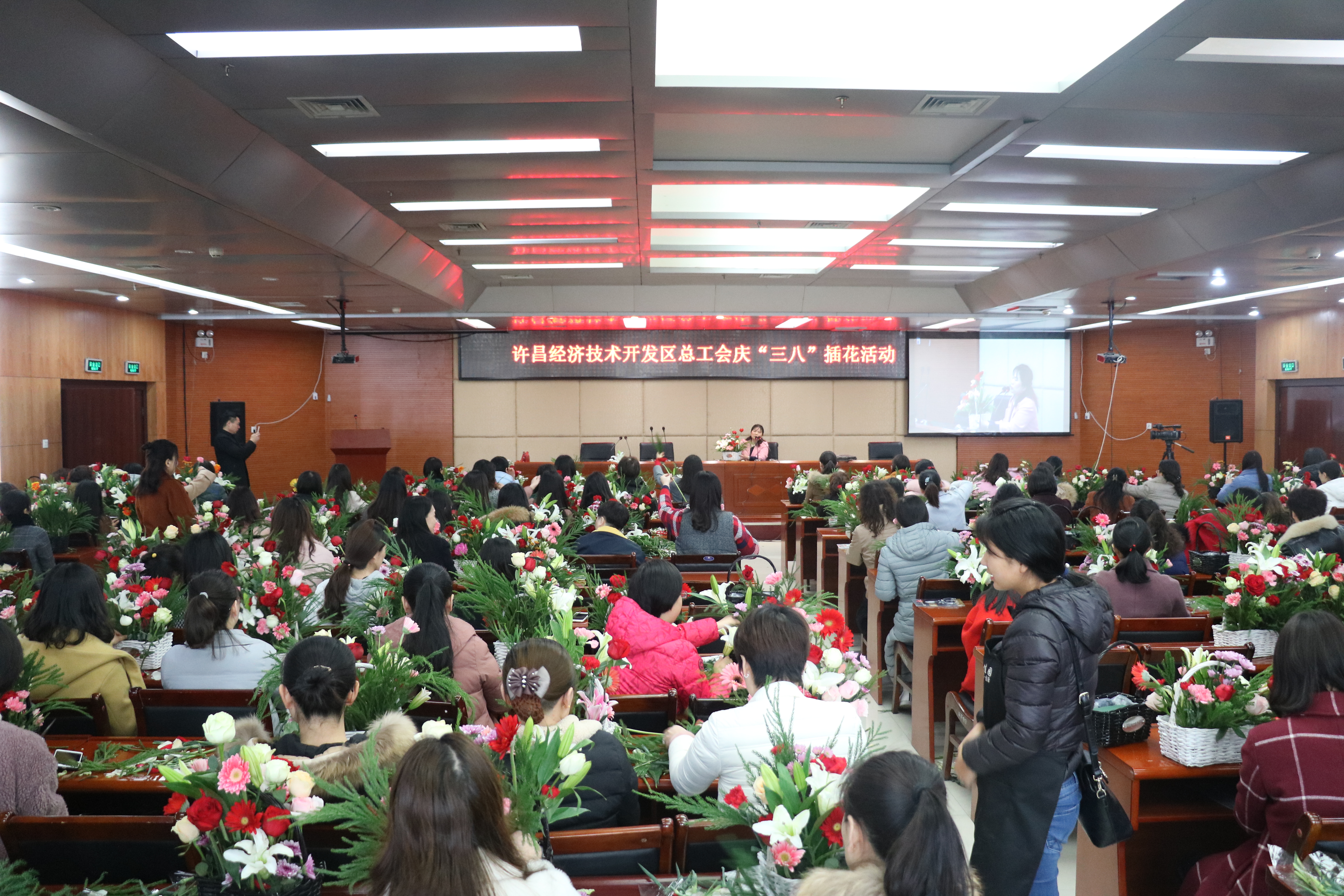 为庆祝第108个“三八”国际妇女劳动节,3月6日上午,开发区总工会举办了“魅力三月?多彩生活”主题插花活动。此次活动邀请了资深的花艺师现场讲解插花方法和技巧,花艺师从花艺基础知识讲起,中国十大名花、花的分类、艺术插花的方法等,让在场的学员耳目一新。在接下来的DIY环节,妇女姐妹们结合花艺师的讲授,充分发挥自己对美的想象和创意,一个个的作品经过花艺师的画龙点睛便成了一个个精美的艺术作品,此次活动,让大家充分掌握了插花的知识和技巧,也感受到了节日的快乐。